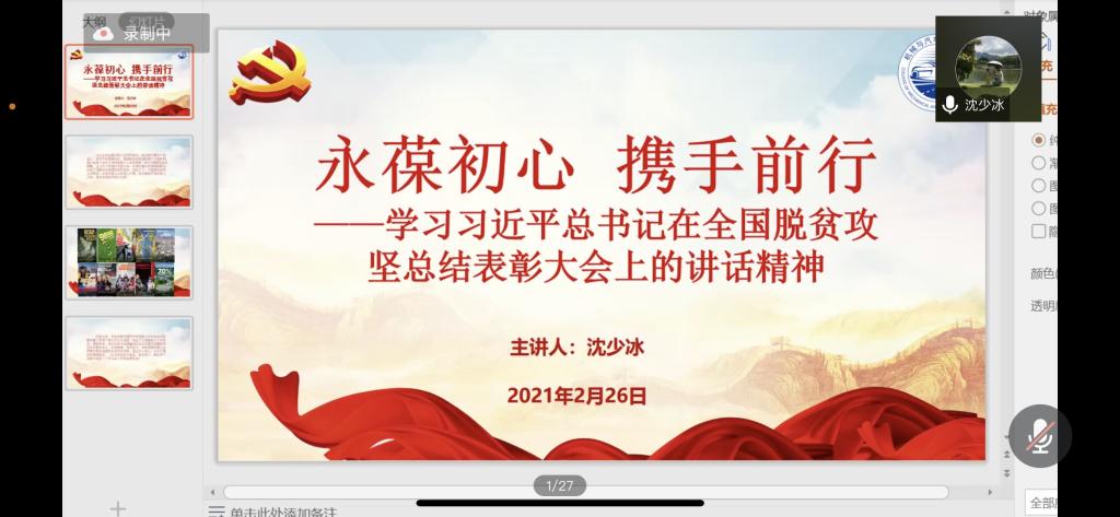 沈少冰老师讲授《永葆初心 携手前行》专题党课。党课内容围绕习近平总书记在全国脱贫攻坚总结表彰大会上讲话精神开展学习。沈老师强调,脱贫攻坚的伟大成绩具有重大历史意义,希望同学们学习“不鹜虚声”的实干精神,脚踏实地,拿出“钉钉子”的劲头,扎实做好各项工作;学习“俯首甘为孺子牛”的奋斗精神,把心思和精力聚焦到本学习主业,锐意进取,要将学习感悟转化为干事创业的精神动力,以更好地成绩献礼建党100周年。